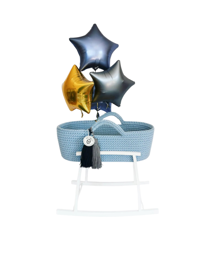 PRODUCT DETAILSHandcrafted with exceptional care, the Blue Almonds Crochet Moses Basket brings timeless charm and modern functionality to your baby's first sleep space. Made from beautifully soft, thick crochet yarn, this basket creates a cozy and breathable environment for newborns, while its elegant design makes it a standout piece in any nursery. Styled here with star-shaped celebration balloons, it’s also the perfect choice for gifting, baby showers, or welcoming a new arrival in style. Comes with: - Mattress - Basket Rocking Stand - Tassels - Waterproof Liner