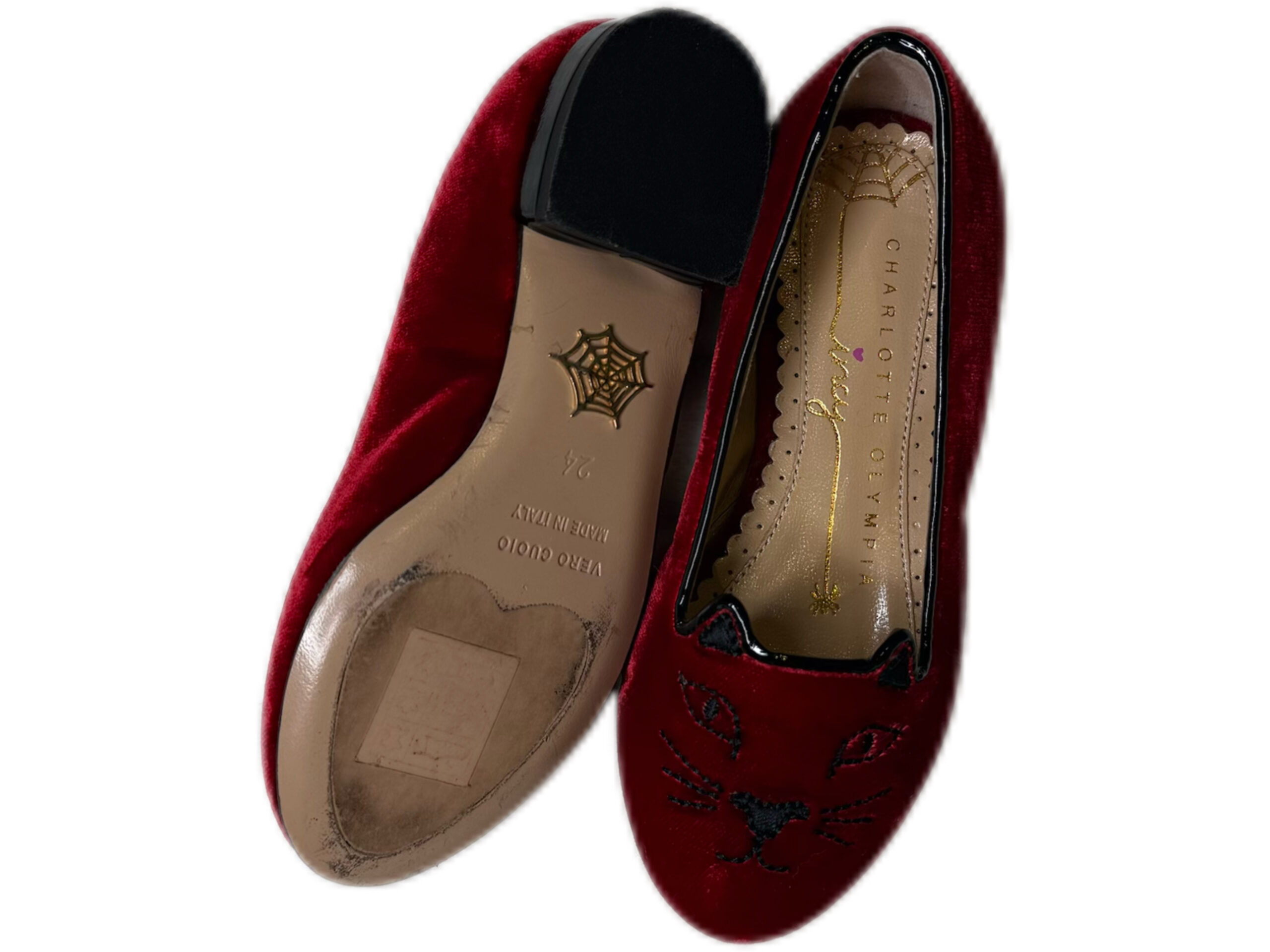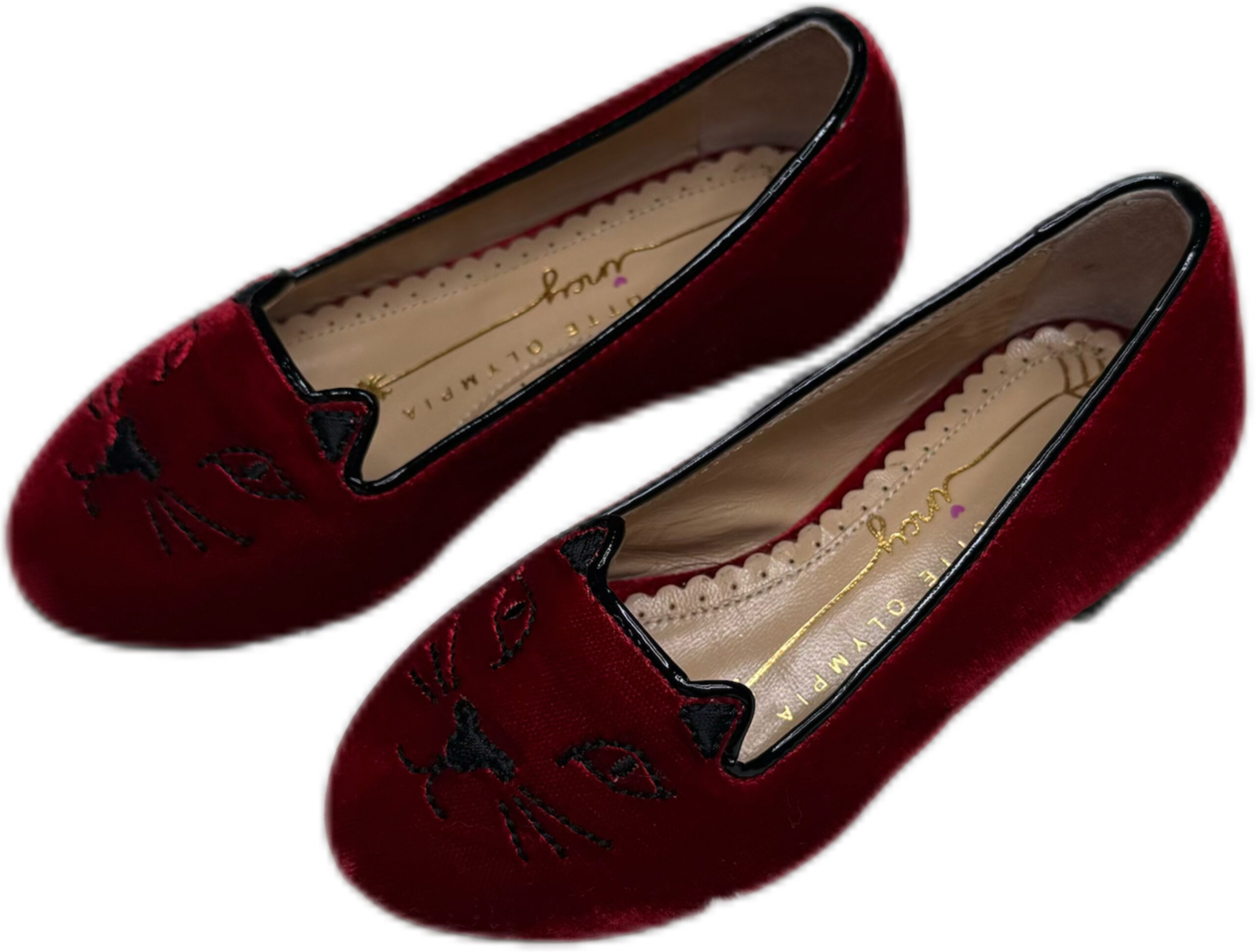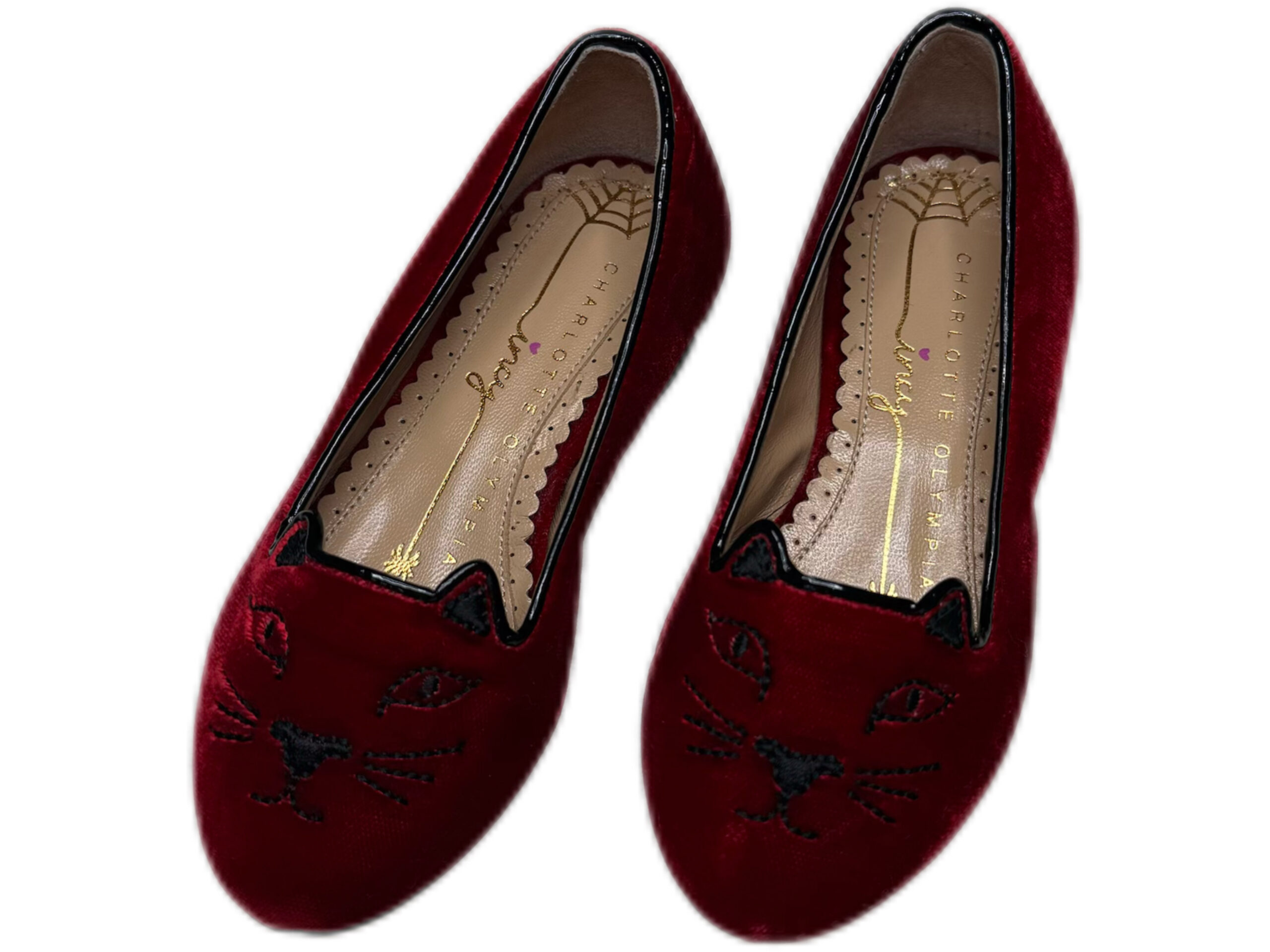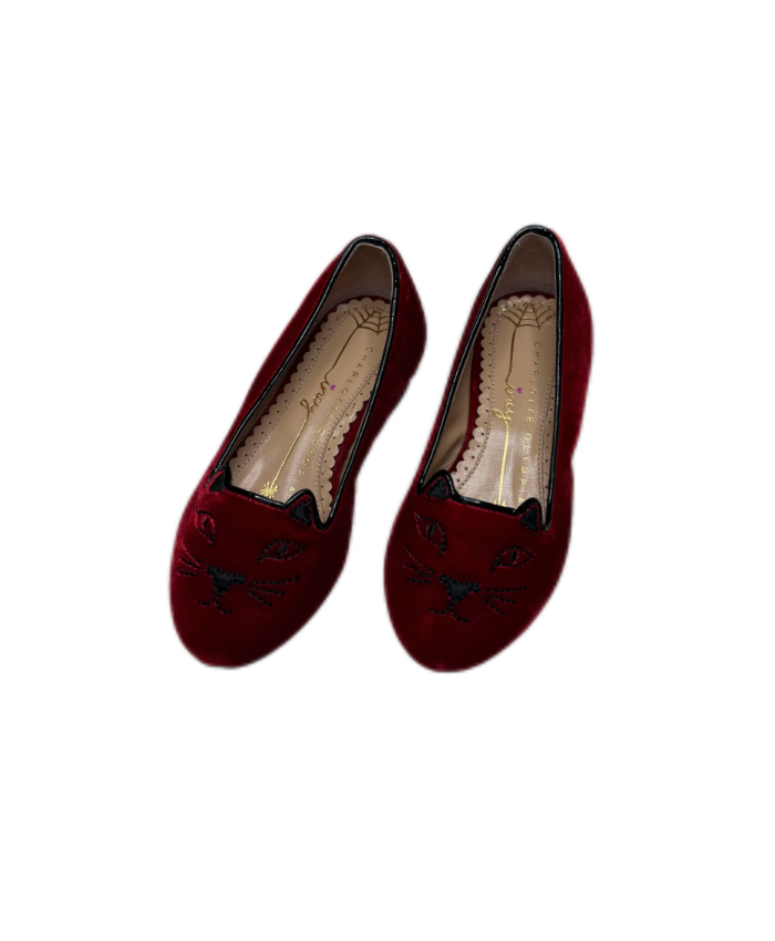 PRODUCT DETAILSAdd a playful touch to her wardrobe with these charming Charlotte Olympia velvet flats. Crafted in rich red velvet, they feature the signature embroidered “Kitty” face and sleek black piping. Soft, stylish, and comfortable—perfect for parties or special occasions. Size: 24 EU Red velvet upper Embroidered Kitty face Black trim detailing Cushioned insole for comfort
