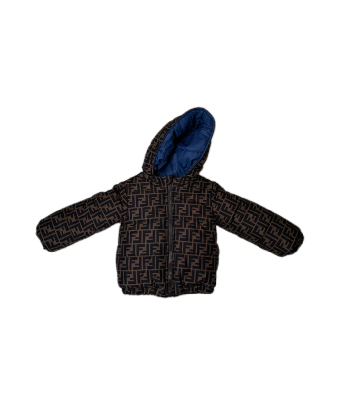 PRODUCT DETAILSFendi Reversible Puffer Jacket Keep your little one warm in style with this premium reversible Fendi puffer jacket. One side features the iconic FF monogram, while the reverse offers a sleek navy finish for a more understated look. Lightly padded for comfort and insulation, this jacket includes a full zip closure, elasticated cuffs, and a cozy hood for extra protection on chilly days.