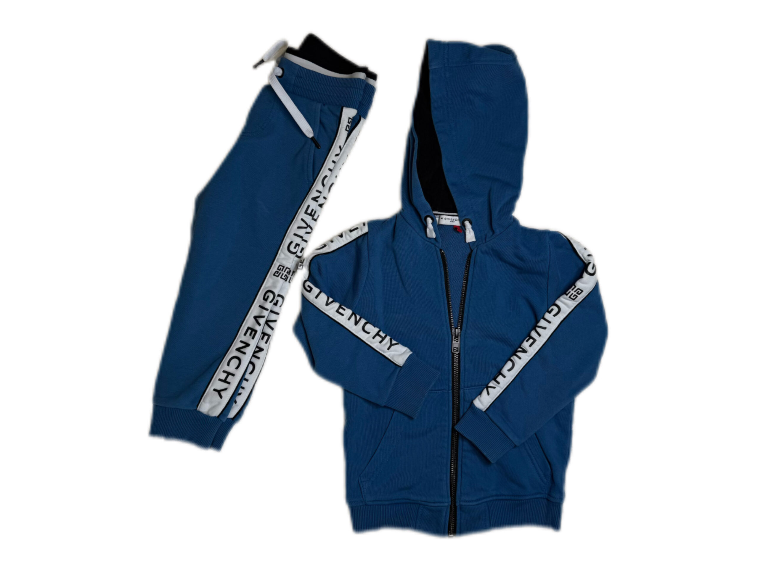 PRODUCT DETAILS4 years old A premium Givenchy Kids tracksuit featuring a zip-up hoodie and matching joggers in a rich blue tone. Both pieces are detailed with iconic white GIVENCHY logo taping along the sleeves and legs, adding a bold designer finish. The hoodie includes a front zip closure and kangaroo pockets, while the joggers are designed with a comfy elastic waistband and adjustable drawstring. A stylish and sporty set perfect for everyday wear with a luxury edge.