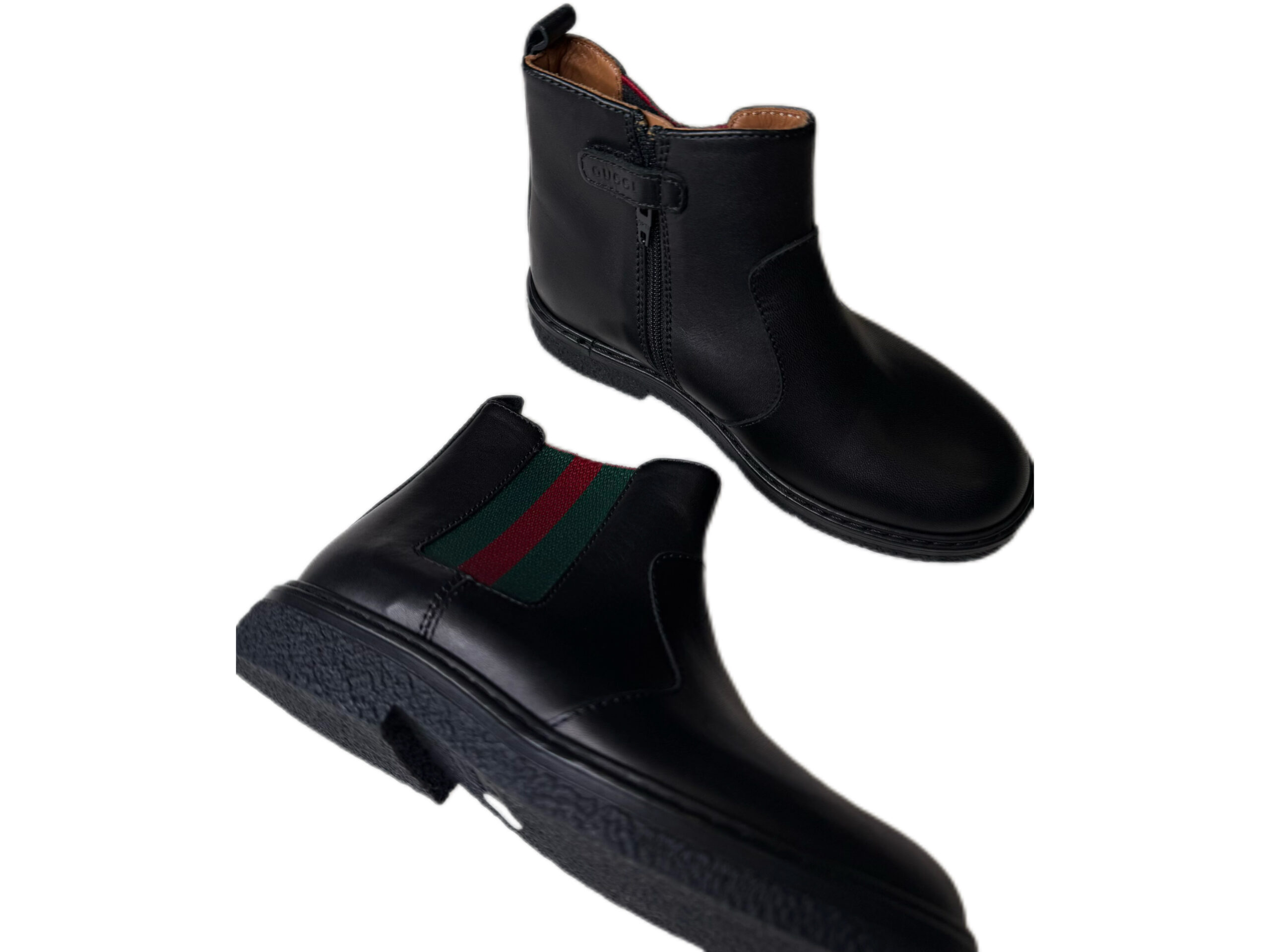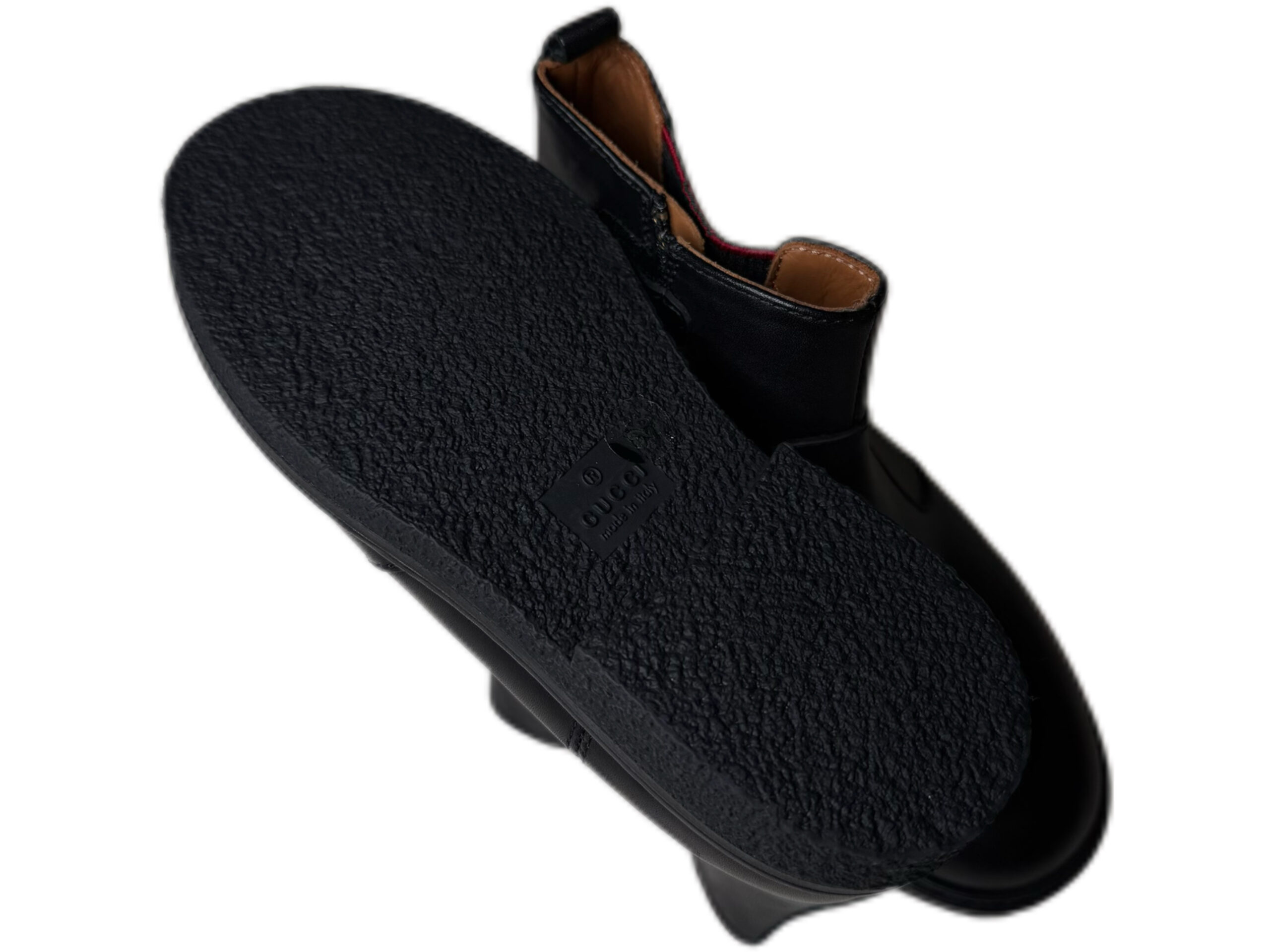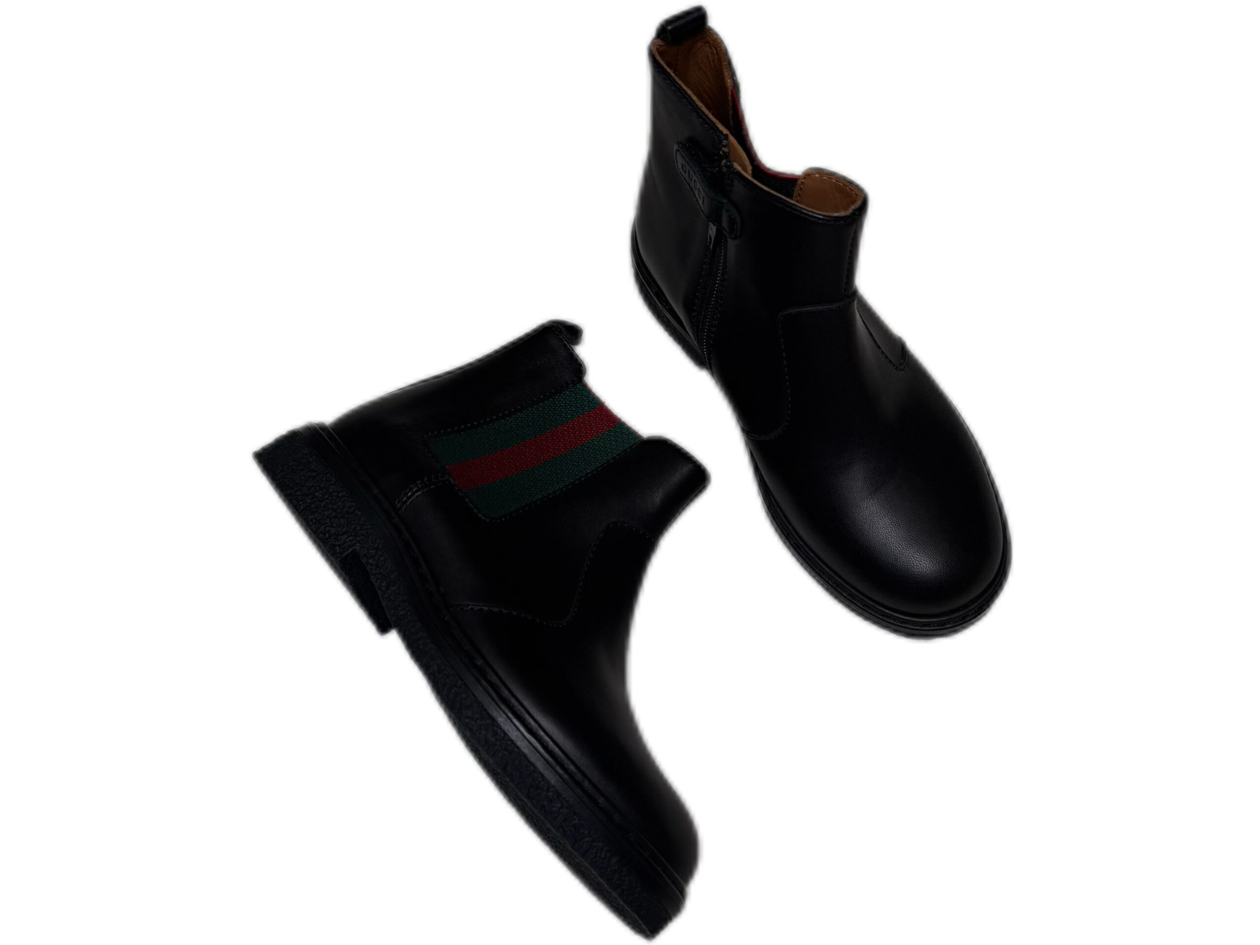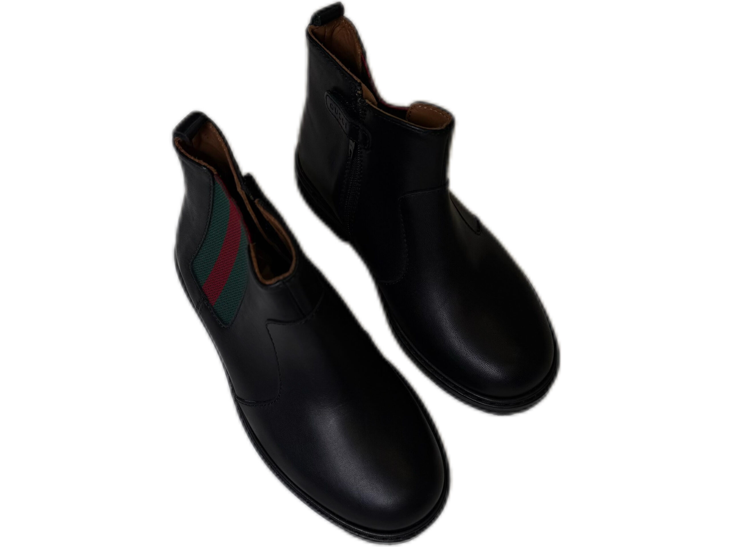 PRODUCT DETAILSElevate everyday outfits with these sleek Gucci Kids leather ankle boots. Made from smooth black leather, they feature the iconic green and red web stripe and a practical side zip for easy on-and-off. Durable, stylish, and crafted for comfort—perfect for dressing up or down. Size: 26 EU Smooth black leather Signature Gucci web stripe Side zip fastening Durable rubber sole
