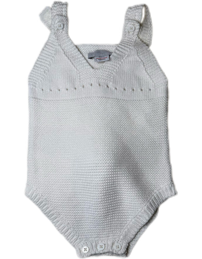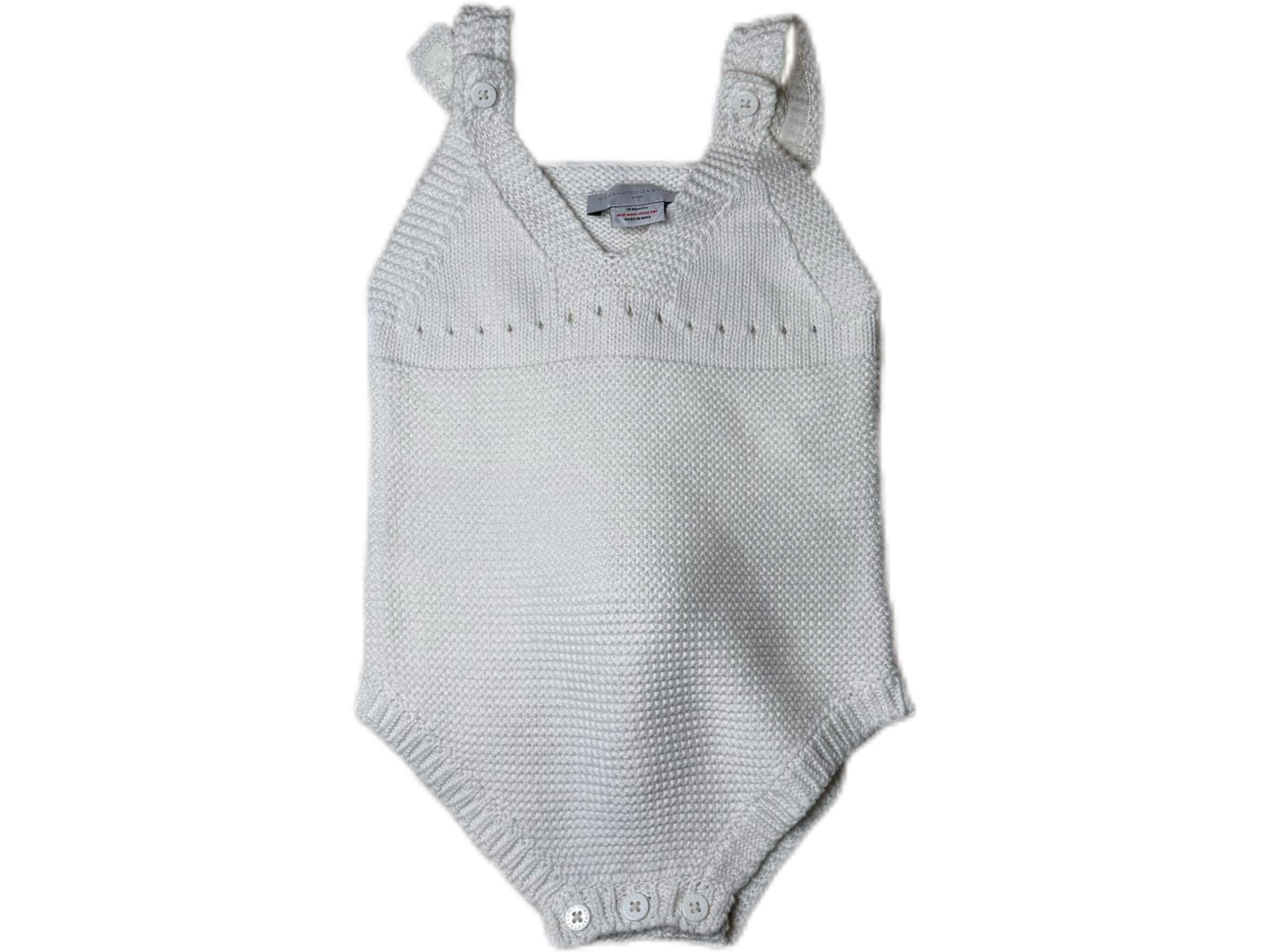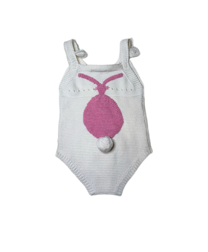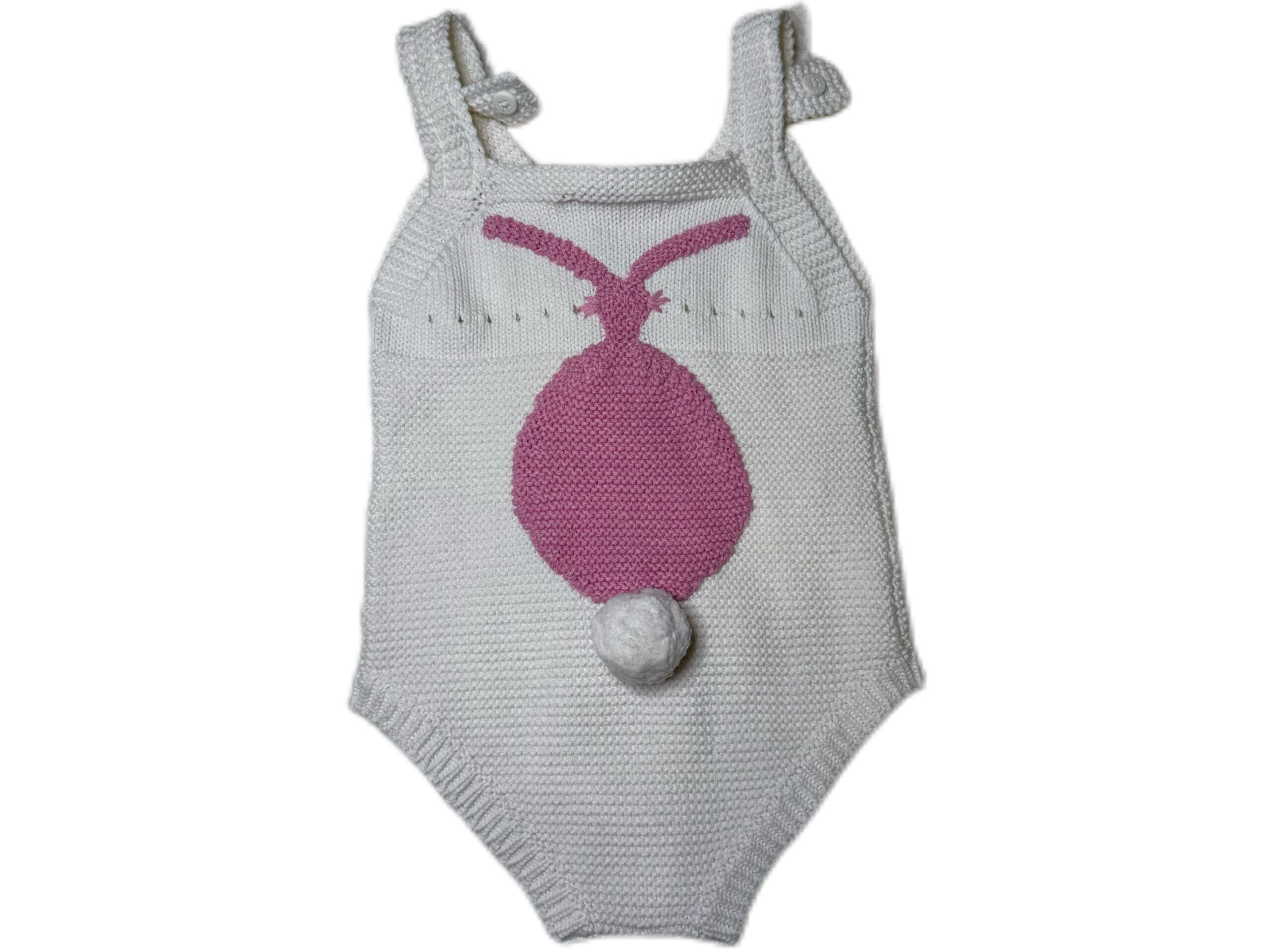 PRODUCT DETAILSA charming Stella Mccartney hand-knit romper featuring an adorable bunny motif with a fluffy pom-pom tail. Made from soft, breathable yarn with button-fastening straps and a secure bottom closure for easy changing. Perfect for special occasions or cozy everyday wear. 18 Months Soft knit fabric Bunny design with pom-pom tail Adjustable button straps Button closure at the bottom