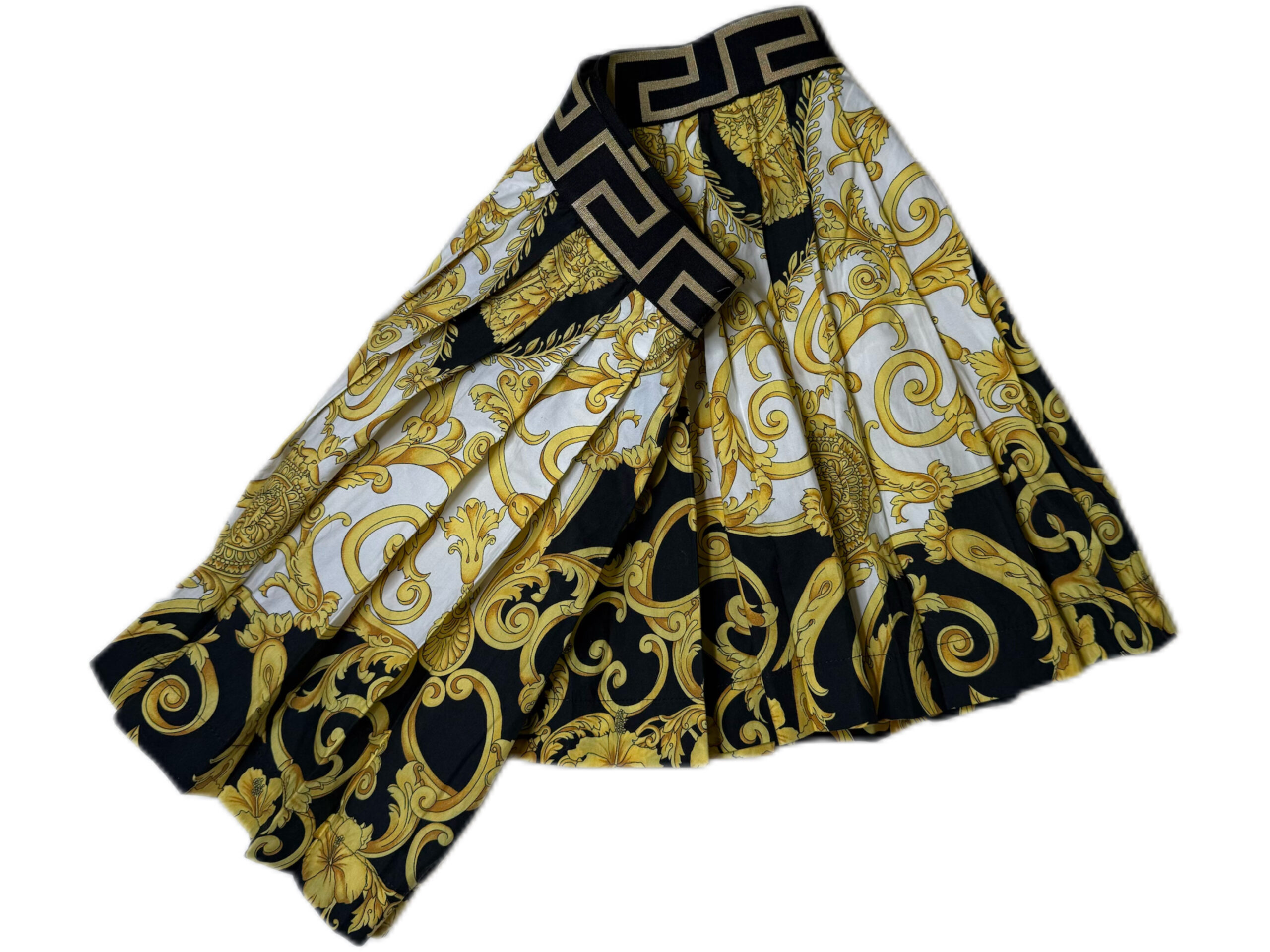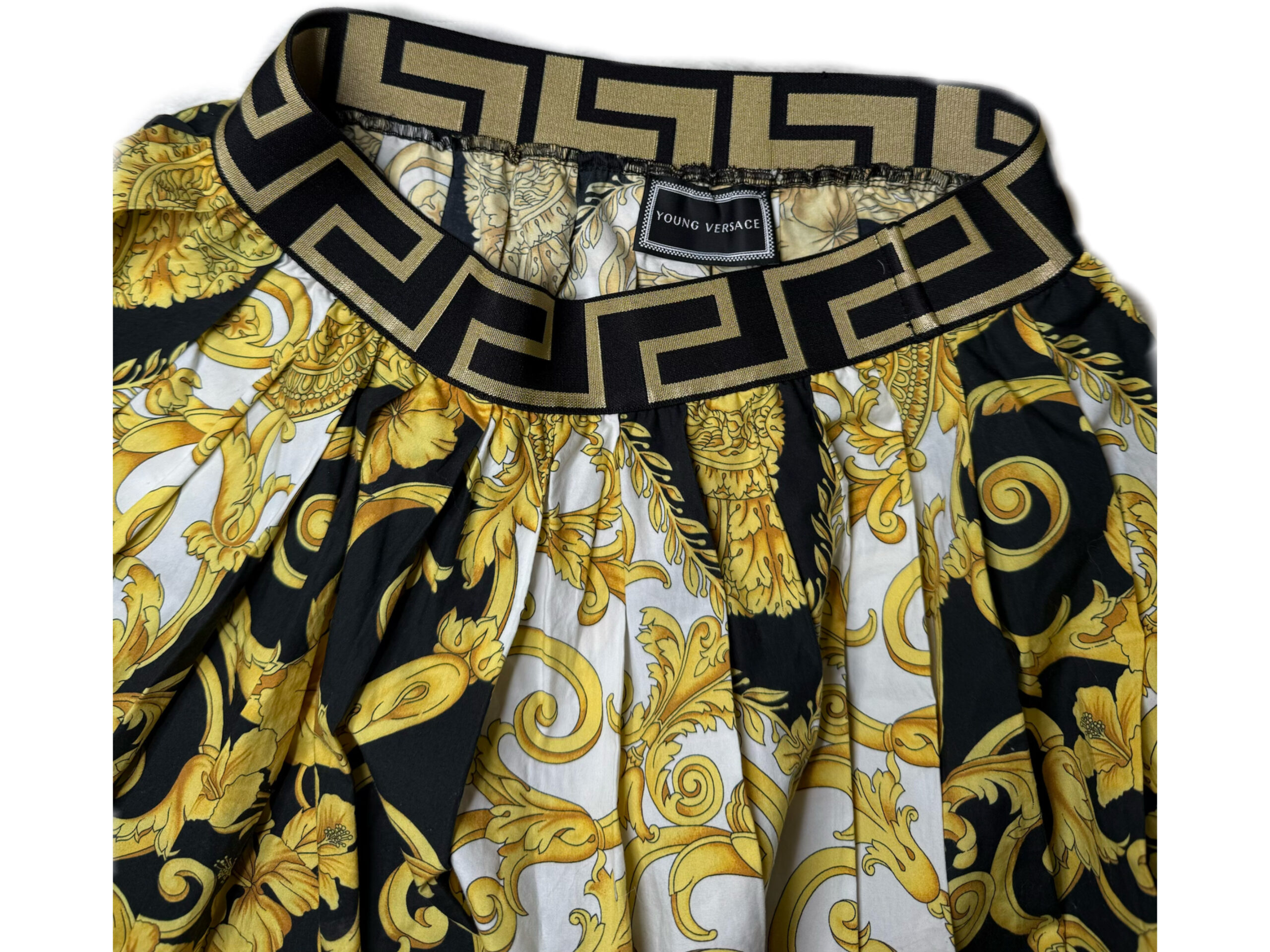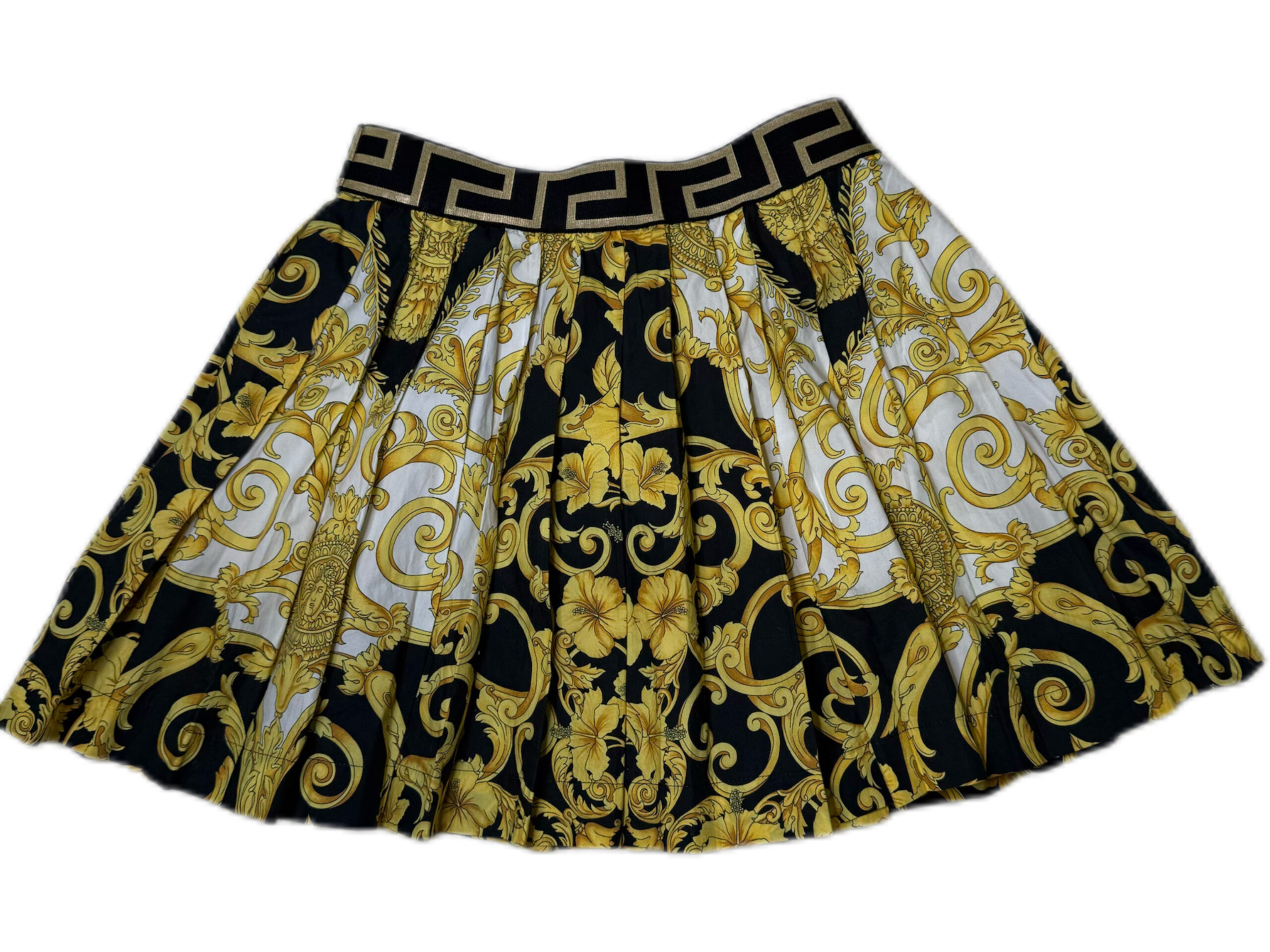 PRODUCT DETAILSA striking Young Versace skirt featuring the iconic gold Baroque print and a bold Greca waistband. The pleated silhouette adds volume and movement, making it a standout piece for special occasions or statement outfits. Sizing is approx 6-8 yrs old Signature Baroque pattern Stretch Greca waistband Soft, lightweight fabric Pleated design for added flair